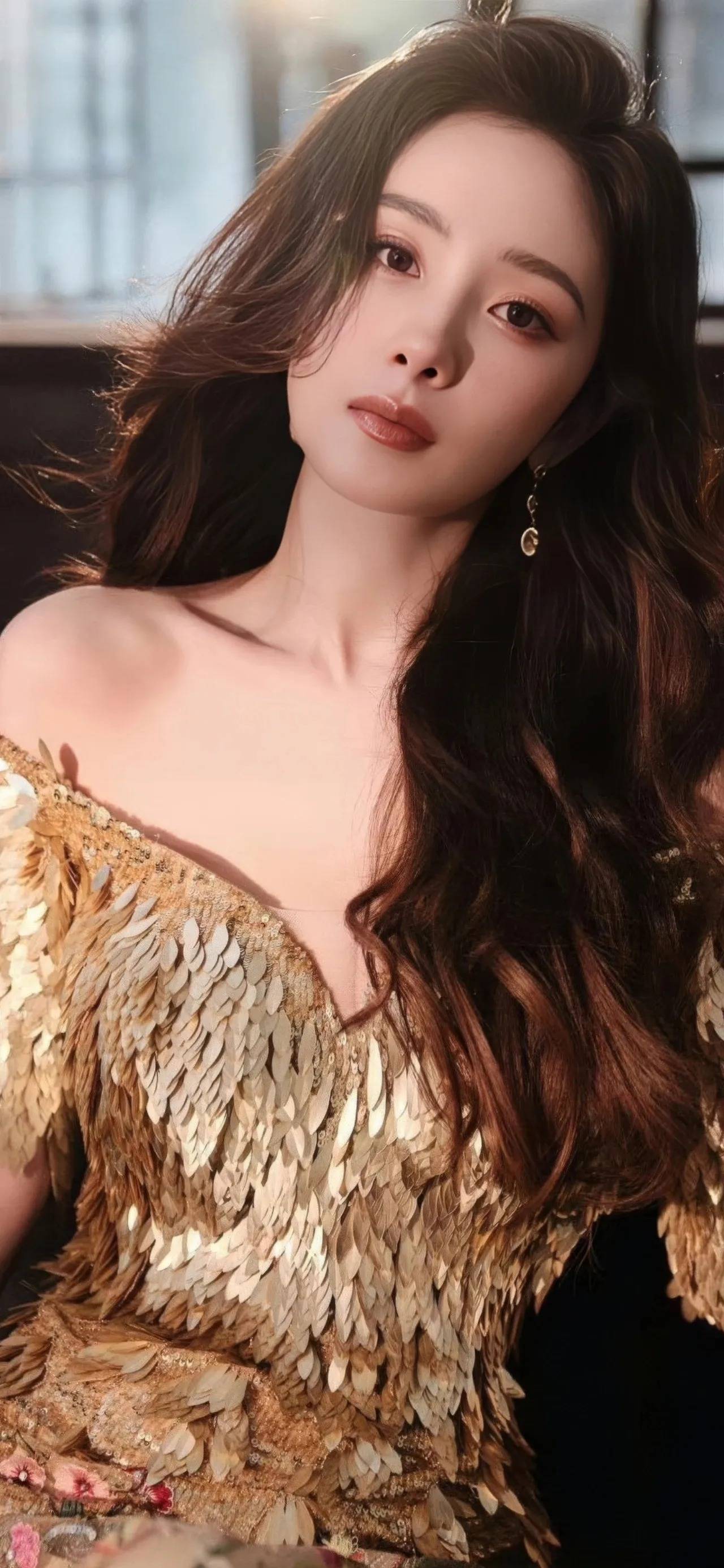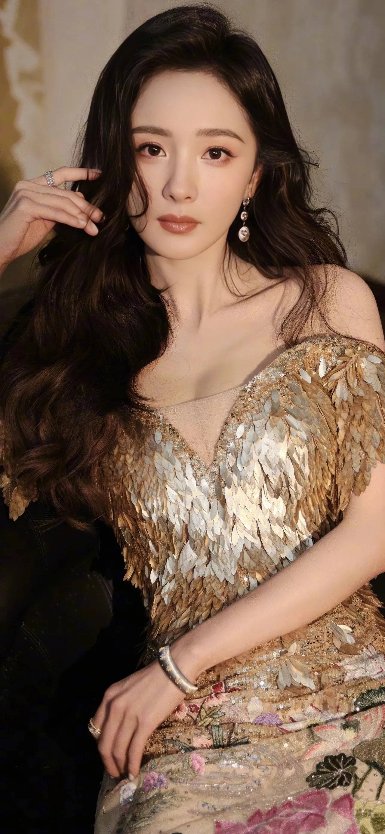 特写镜头下,杨幂如瀑的长发与礼服的金色羽毛相互缠绕,形成质感上的强烈对比 —— 发丝的柔软与羽毛的华丽碰撞,刚柔并济。仔细端详,会发现每一片 “羽毛” 都经过精心排布,边缘微微卷起,似真羽般灵动,足见礼服制作工艺的精湛。这种对细节的极致追求,正是时尚造型中最动人心魄的力量。