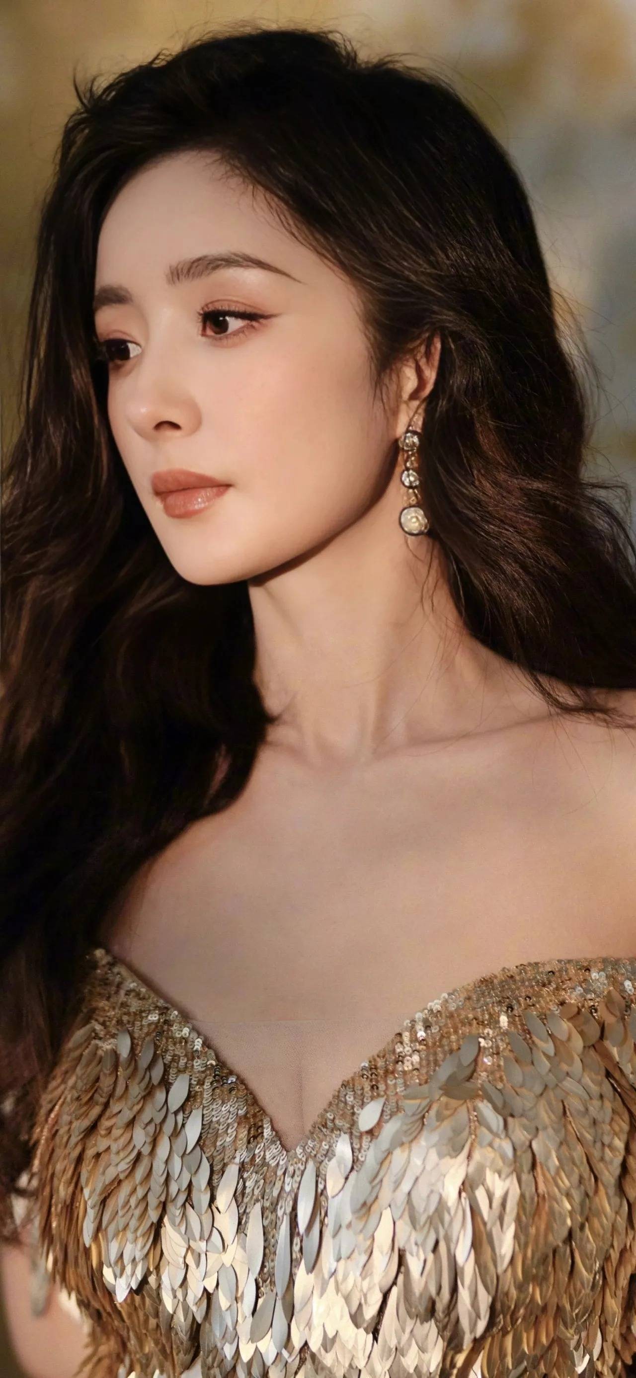 侧面视角中,杨幂佩戴的耳环成为视觉亮点。精致的圆形吊坠搭配碎钻点缀,与金色礼服相互辉映,在光影中流转出璀璨光芒。露肩设计下,她的颈部线条修长优美,锁骨微微凹陷,礼服的羽毛装饰如同为她定制的华丽披风,将她衬托得既高贵又迷人,每一个角度都经得起镜头的推敲。